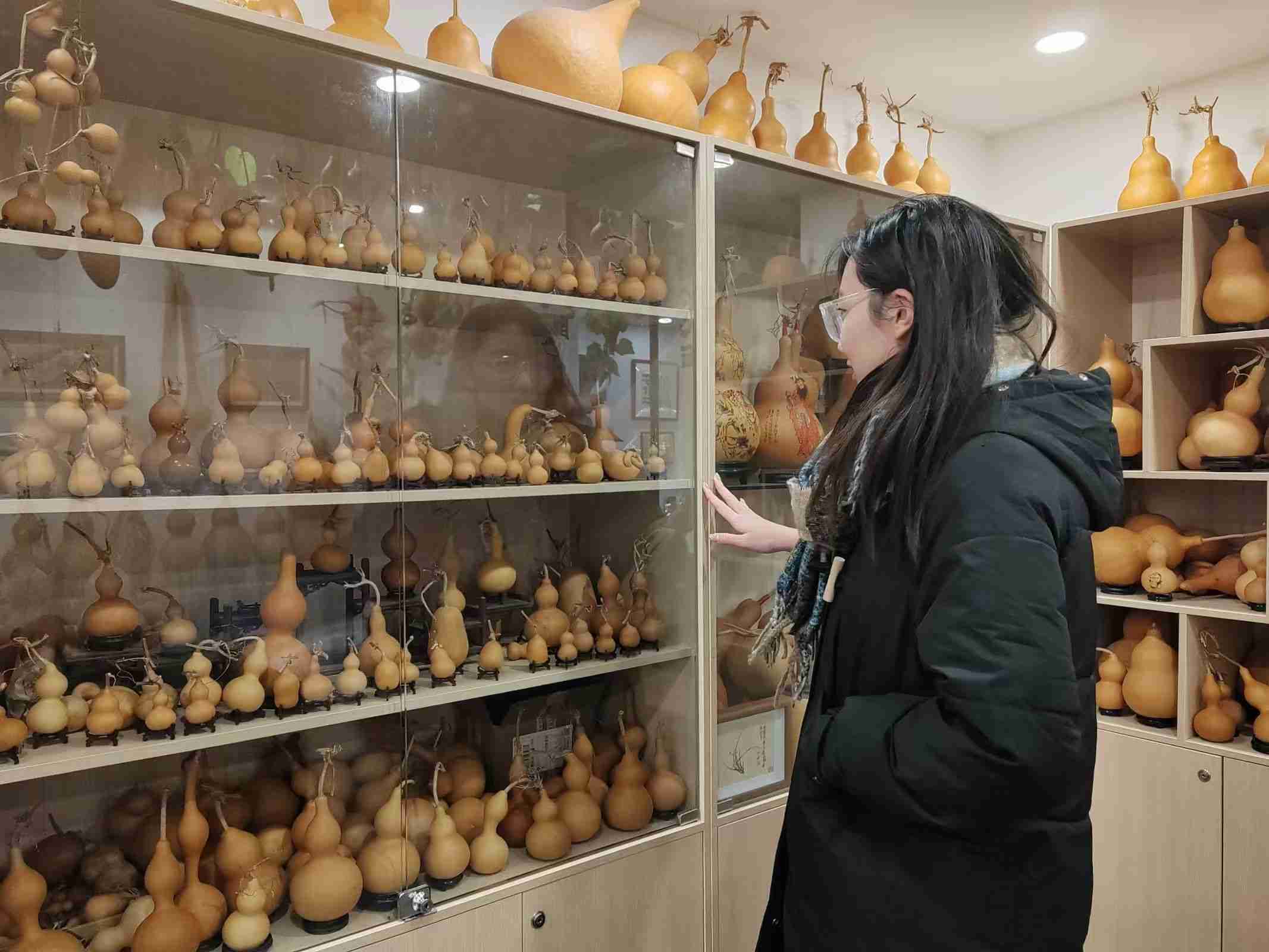 我们实践队来到了十笏园的展览厅,仿佛闯入了一个葫芦的奇幻世界。厅内,形态各异的葫芦有序陈列。有的葫芦小巧玲珑,仅盈盈一握,表皮细腻似羊脂玉,泛着柔和光泽,其上以工笔绘就花鸟鱼虫,色彩明艳,笔触细腻,那鸟儿仿佛下一秒就会振翅飞出;有的葫芦则硕大饱满,稳稳立在特制底座上,宛如憨厚敦实的胖娃娃。其周身雕刻着古典故事,人物栩栩如生,亭台楼阁错落有致,刀法刚劲有力又不失细腻,每一处线条都诉说着葫芦背后的文化底蕴。队员们驻足观赏,不禁感叹其中传统工艺与自然之美的完美融合。更加领悟到传统文化是一座蕴藏无尽智慧的宝库,是我们民族的根与魂。
