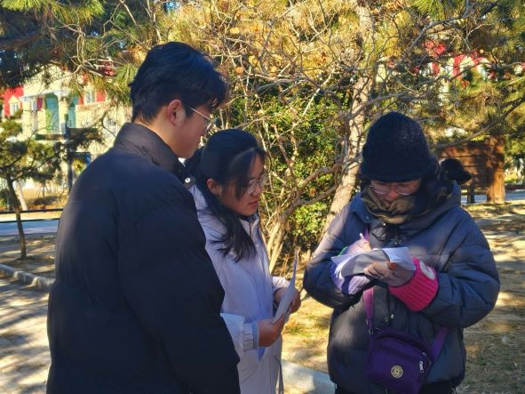 图为社会实践队队长尹新颖为队员讲解实践队调研方向。尹新颖 供图实践活动开始前,团队成员进行了充分的知识储备。通过查阅大量文献资料,深入学习土地利用变化的类型、驱动因素以及碳排放的计算方法、影响因素等理论知识。在知识储备完成后,团队制定了详细的实践计划。定于1月10日以日照海滨国家森林公园和银河公园作为主要调研区域,该区域涵盖了多种不同土地利用类型,具有典型性和代表性;翌日前往星岛蓝碳计划了解日照市海岸线“保护优先,科学开发”的原则。根据调研区域特点,将实践内容划分为实地考察、问卷调查、访谈交流和数据收集分析四个部分,并明确了各成员的分工和时间节点,确保实践活动有序进行。