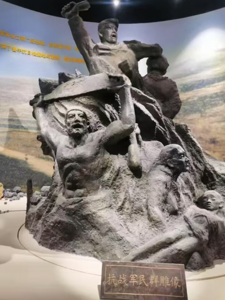 接着,薪火相传实践队的队员们来到了抗战军民群雕像面前。在这我们可以感受到淄博过去有关解放战争的历史,了解当时的人物事迹,从中深切的体会到过去共产党员和人民群众之间的紧密联系,以及中国共产党的伟大革命精神。相信所有人看到都会为之动容,再次回想起过去的峥嵘岁月,再次被红色文化的魅力所吸引。该雕像展现了抗战时期军民奋起反抗的英勇姿态,体现了军民团结一心、同仇敌忾的伟大精神,让人不禁赞叹解放战争时期人民解放军的不怕苦不怕累,保家卫国无私奉献的精神品质。同时,激励着我们后辈继续传承红色基因,不忘历史,砥砺前行。