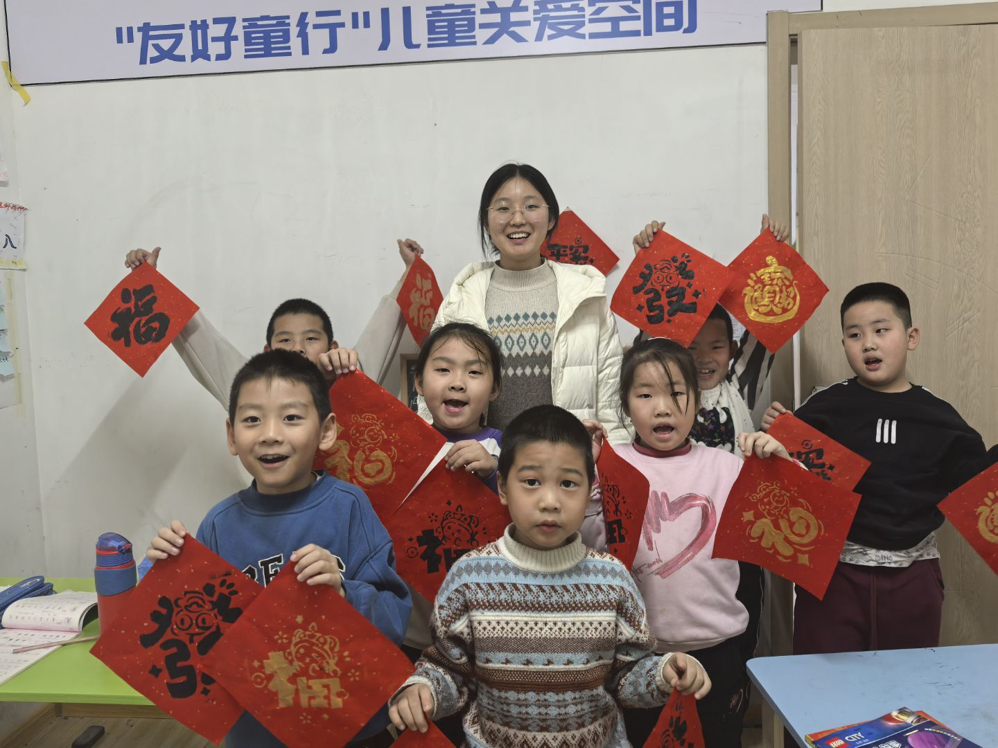 下午,来自山东大学的本科生苏喜悦为孩子们带来了传统文化手工课程——《新春拓印画》。不仅仅是孩子们,志愿者们也积极参与其中,帮助孩子们完成了一幅又一幅带有蛇形元素的年画。这些作品不仅展示了孩子们的创造力,也为即将到来的春节增添了浓浓的“年味”。