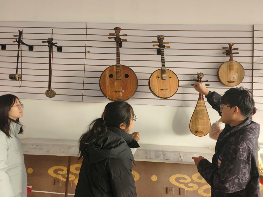 图为剧团工作人员向实践队员介绍在茂腔演出中常用的乐器,包括京胡、大阮、笙等。在演出中经常用乐器模拟场景中会出现的声音,渲染氛围。吴俊瑶 供图