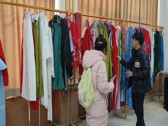 图为实践队员了解茂腔戏服,它们主要在演员表演一些传统剧目时被穿着。王中贞 供图