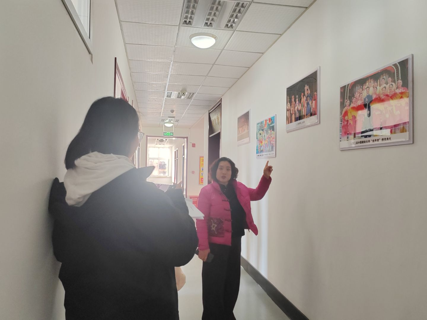 图为贤继红老师为实践队员结合在走廊上展出照片介绍其背后的故事。张昕 供图