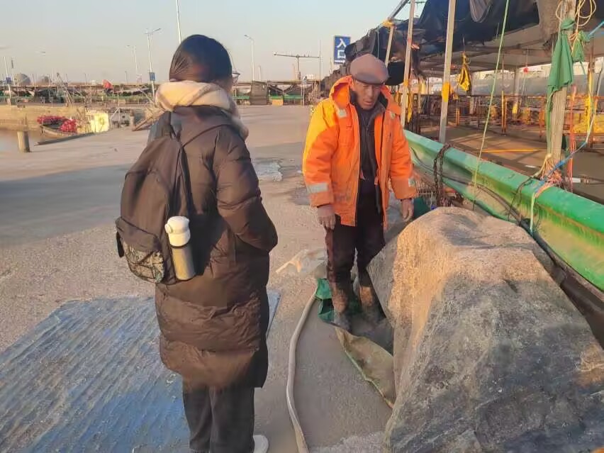 图为社会实践队队员与渔民交谈
