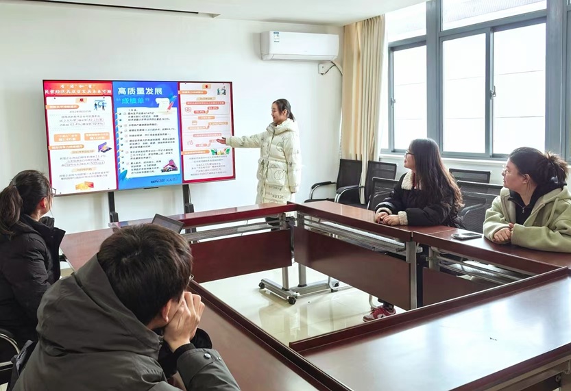| (图为1月9日,“民企新韵展宏图,访企新程梦志行”团队成员常璐向江苏开天工程咨询有限公司员工介绍我国近年来高质量发展成绩单。常璐供图) |