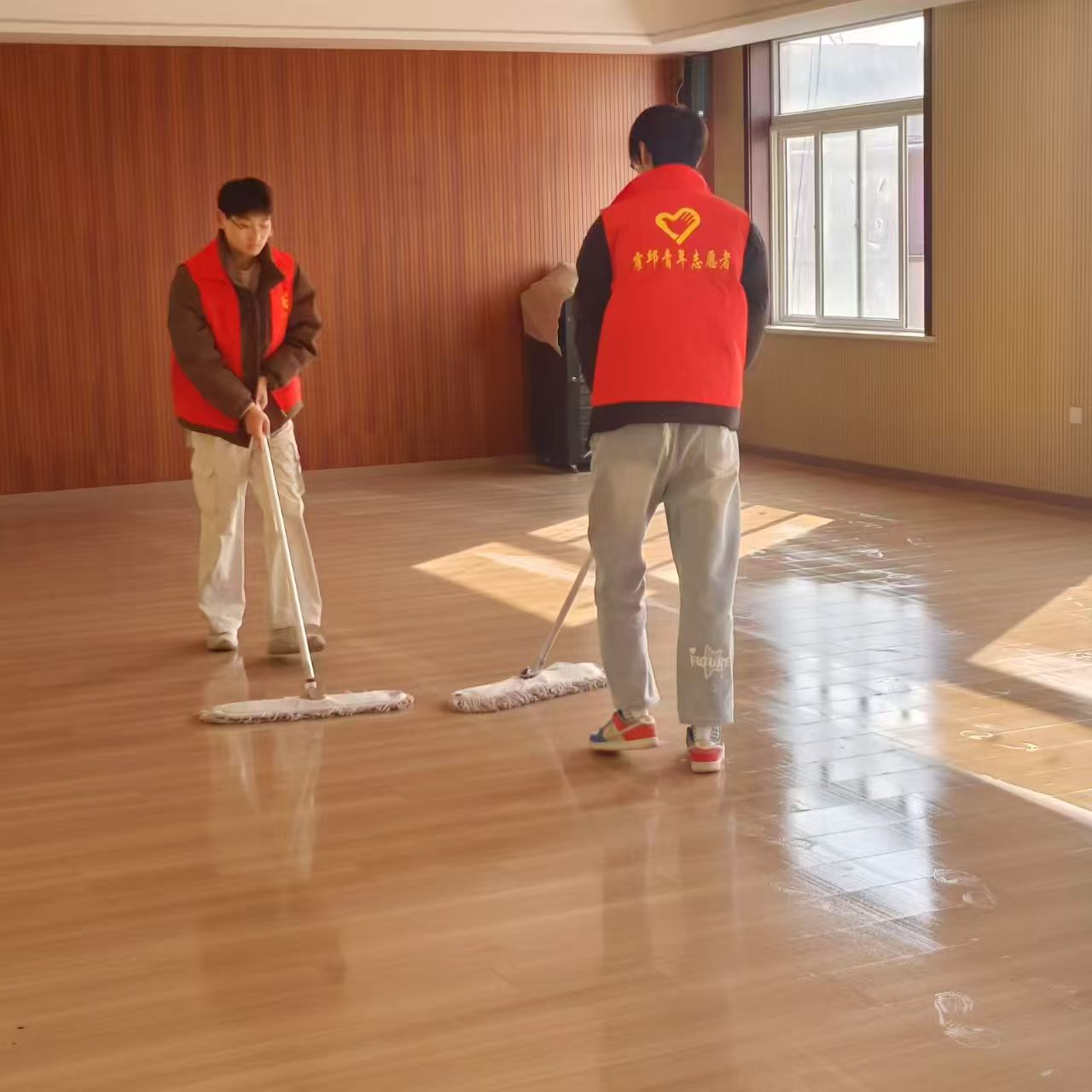 图为志愿者成员正在认真清扫图书馆的地面,让阅读环境更加整洁。通讯员 黄新俨 供图