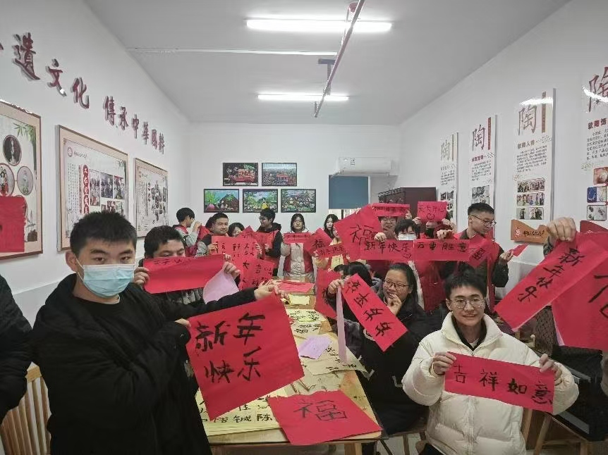 接着,在年会彩排的休息时间,材化学子阳光助残益行团的成员们拿出了早已准备好的写字工具,带领并教授残疾人们写"福"字,一同制作了百福图,活动现场热闹祥和,团队成员与残疾人们其乐融融。