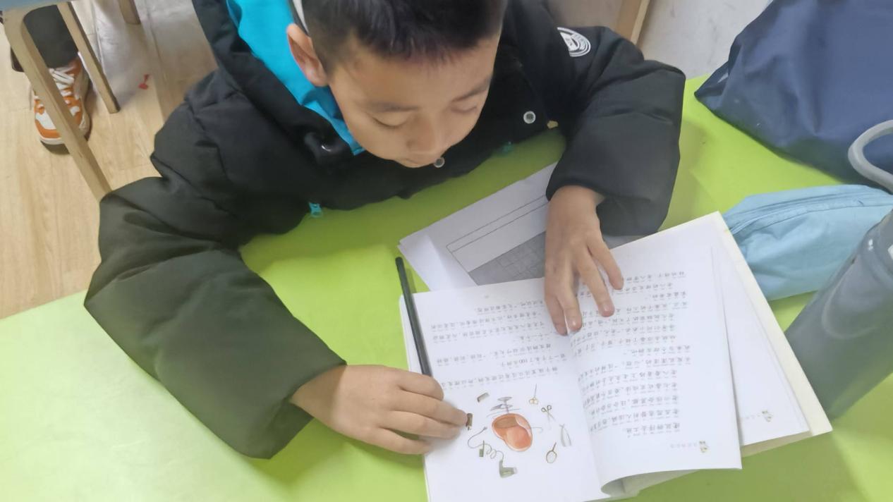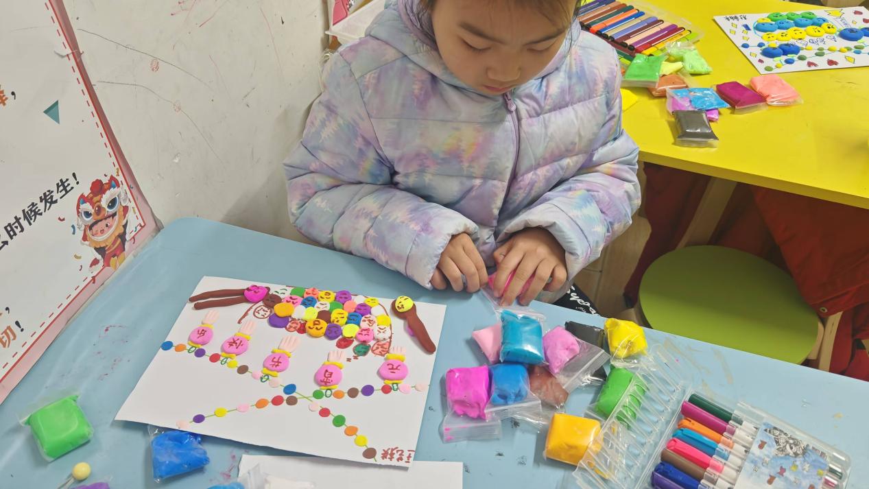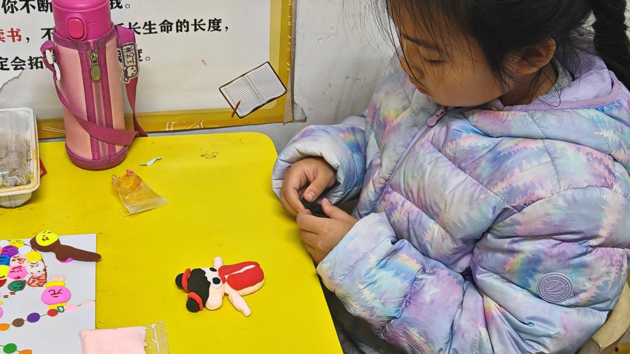 下午两点,在简单的破冰游戏后,小朋友们进入学习状态。山大唐社的李子晗同学教小朋友们使用太空泥在硬纸卡上进行绘画创作。在李老师耐心的引导下,孩子们的创意如同春日破土的新芽,蓬勃生长。孩子们不局限于既定的框架,将自己独特的想象融入创作,每一个作品都别出心裁,充满童趣,淋漓尽致地展现出孩子们热爱创作的纯真天性 。