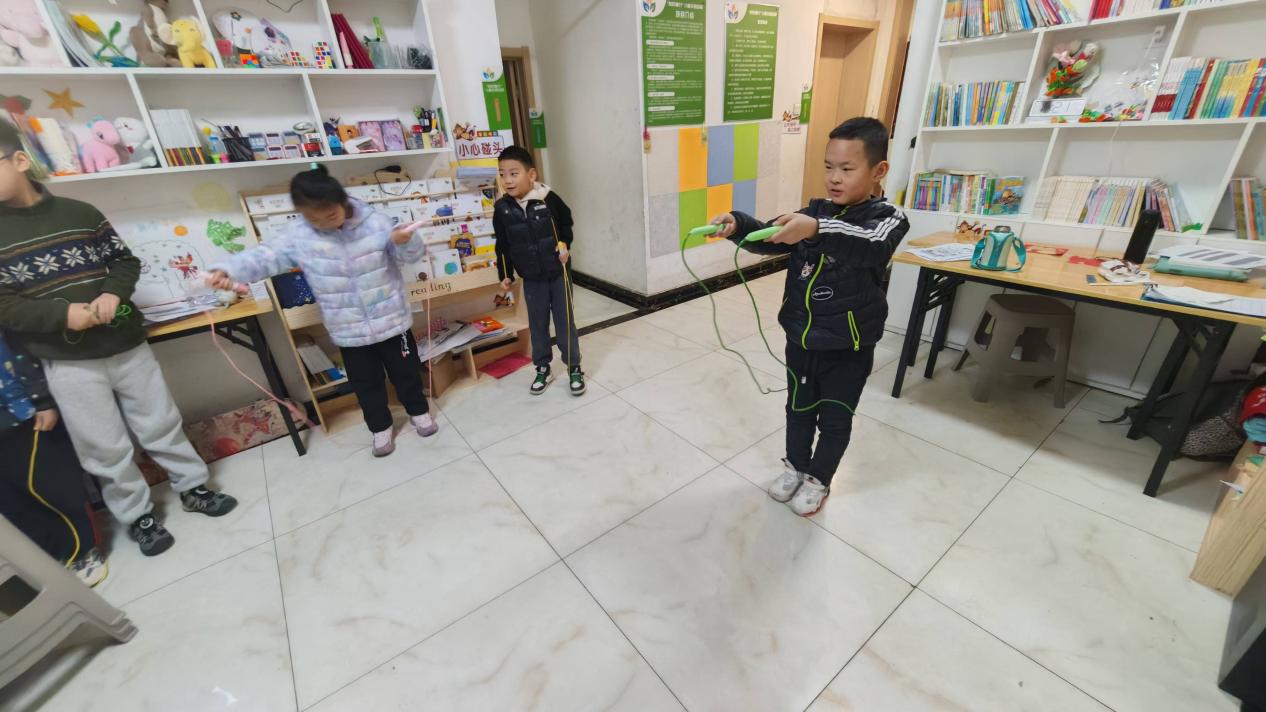 下午三点,小朋友们进行短暂休息后,唐社的孙延坤同学协助小朋友们开展了跳绳比赛。孩子们如欢快的小鹿般踊跃参加,同时,唐社的志愿者李子晗同学也参与到了比赛当中,这一举动点燃了小朋友们的热情,孩子们欢呼雀跃,处处洋溢着积极向上的朝气。