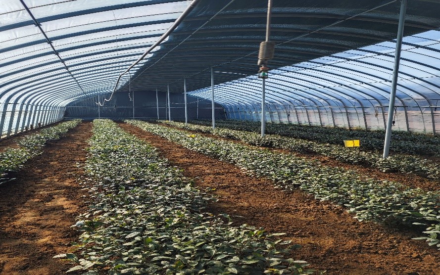 实践队首先到达日照碧螺山茶园。在茶园负责人的带领下,队员们参观了茶园的种植区与采摘区。负责人向队员们介绍了茶园采用的现代化种植技术,包括智能灌溉系统、病虫害监测预警系统等新型种植技术。队员们还观察到大棚技术在茶叶种植中的运用,大棚不仅能够调节温度和湿度,为茶树提供稳定的生长环境,还能有效防止极端天气对茶树的影响,提高茶叶的产量和质量。图为实践队参观的茶园大棚。中国青年网通讯员 赵鸿超 供图
