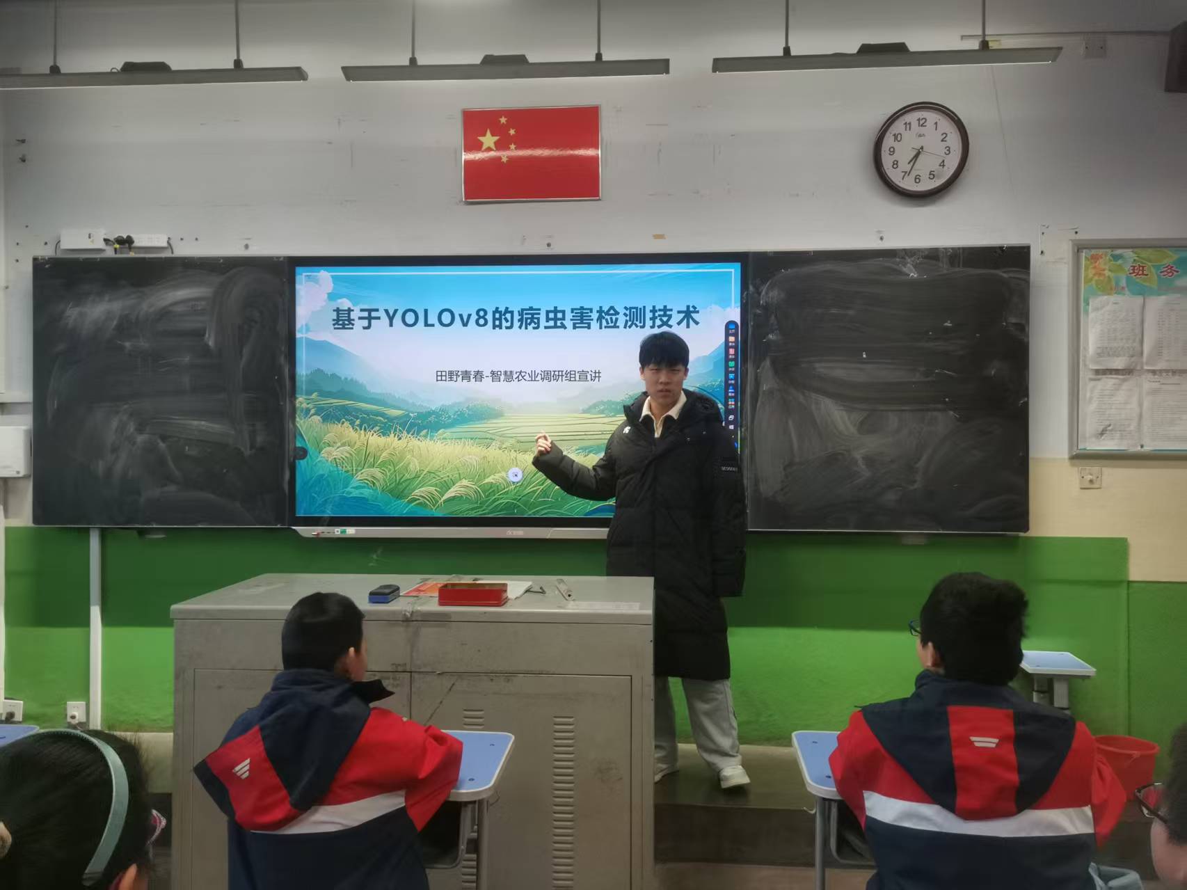 在宣讲过程中,吕明哲同学以通俗易懂的语言向同学们讲解了病虫害检测技术的基本原理及其在农业中的应用场景,详细阐述了该技术如何帮助农民识别病虫害,避免农药过度使用,进而提高农作物产量,保障食品安全。同时,吕同学将相关技术的使用场景与生物学、地理学等学科进行结合,向同学们展示了农业与其他学科交叉融合的方向,引发了同学们对不同学科之间联系的兴趣。