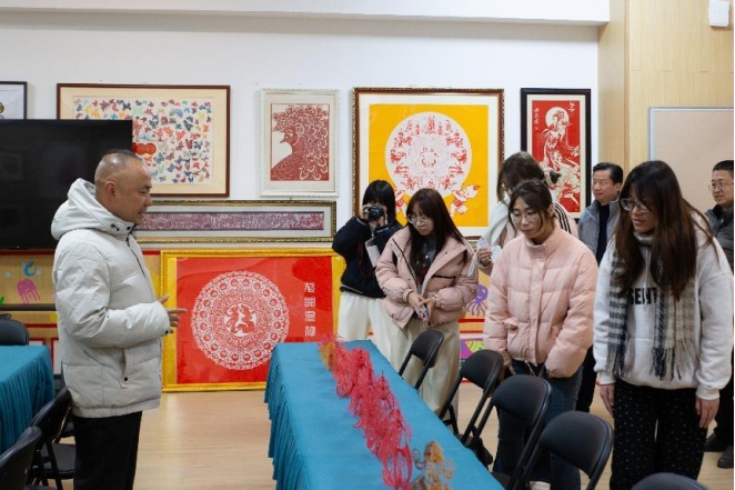 余晓汉先生向实践队员们介绍剪纸作品