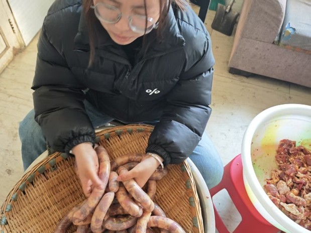 1月26日,在贵州的实践队成员参与了杀年猪这一项重要的过年习俗。杀年猪通常在腊月进行,这意味着当年风调雨顺、六畜兴旺、日子红火。主人家会选好吉日,邀请亲朋好友、邻里乡亲来帮忙。众人齐心协力,经过烧水、赶猪、按猪、烫猪毛、刮猪毛等一道道工序。杀年猪结束后,主人家会宴请帮忙的人共同吃“杀猪宴”,也被称作吃“刨猪汤”。菜品的重头戏是猪肉,如炒猪肝、回锅肉、红烧肉等。大家围坐在一起,一边品尝美味的杀猪菜,一边唠着家常,欢声笑语,其乐融融。
