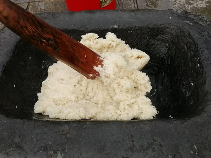 1月27日,在云南的实践队成员与家人一起进行了舂粑粑这项活动。首先,选择优质的糯米和饭米,通常按3:1的比例混合。随后将米浸泡在水中至少4个小时以确保米充分吸收水分。第二天,将浸泡好的米蒸熟,经过两次蒸煮以确保米粒完全熟透。将蒸熟的米饭放入传统的石臼中。舂粑粑时,几个人会轮流用脚踩踏碓尾,使碓头有力地起落,舂捣石臼中的糯米。这个过程需要一定的节奏和力量,以确保糯米舂得细腻均匀。在舂米的过程中,需要一位经验丰富的操作者在石臼旁迅速而精准地翻动米团,确保每一处糯米都能均匀受力。当米饭舂成粑粑状后,操作者会将米团从碓柱上取下,放在涂好蜂蜡或香油的芭蕉叶上,摊成薄饼状进行阴干。