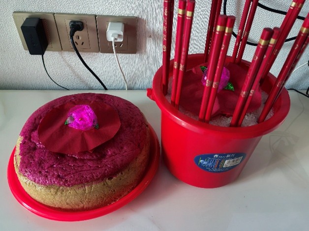 1月28日,闽东地区的队员们实地观察和深入参与春节习俗活动。祭灶时,长辈们摆上灶糖、纸元宝等贡品,送灶王爷“上天言好事”。将大米倒入红桶中,插上十双红筷子,圆红纸覆在中间,用红花固定,再取一张圆红纸包住两块大银,这便是“插红”的仪式。在这些充满烟火气的仪式里,队员们深刻体会闽东地区传承千年的文化记忆,每一个细节、每一种供品,不仅感受到的是浓浓的年味,更是对传统的坚守,对未来的期许。