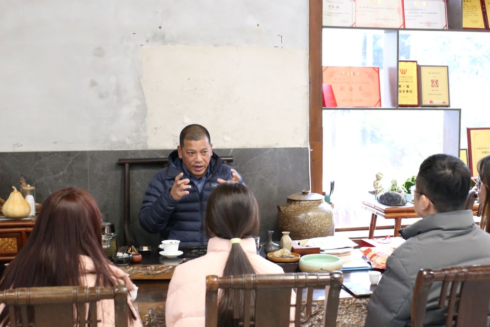 图为实践队队员与福州市级非遗项目连江黄岐鱼丸制作技艺传承人林禹交谈