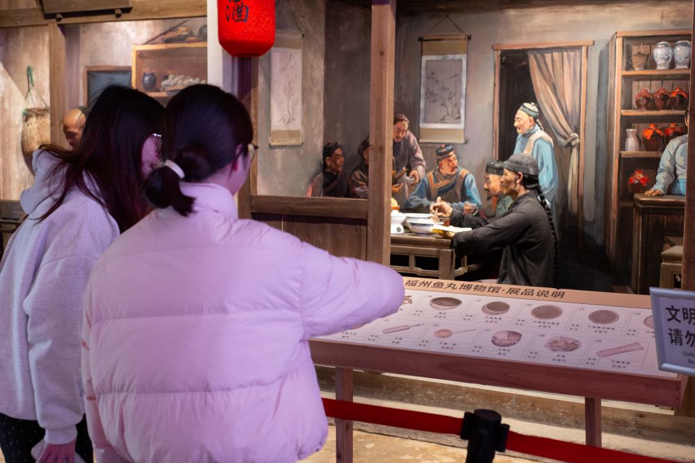 实践队首站抵达福州鱼丸博物馆,在展厅的指引下感受连江鱼丸的历史变迁、制作工艺、文化传承。在寻根厅,透过斑驳的照片看鱼丸的起源,找到鱼丸之“根”;在寻味厅,了解传统鱼丸制作的“七步”法,并通过先进的现代科技观摩传统鱼丸制作工具的演变,追溯鱼丸之“味”;在寻福厅,看品类多样的鱼丸文创产品,在“百福”之中感受鱼丸于福州的重要地位;在寻缘厅,先进的科技与古老渔家故事的结合,诉说着鱼丸兴起之“缘”;在寻渔厅,连江渔民的聪明才智映入眼前,小鱼丸带动大渔业的发展。“既要靠海吃海,又要养海耕海”,在展厅最后,镌刻着习近平总书记的重要指示。福州鱼丸博物馆是非遗文化与现代经济的优秀结合,是连江县文旅产业的发展亮点,以地方特色产业带动城市发展,是连江县文旅融合发展的代表。