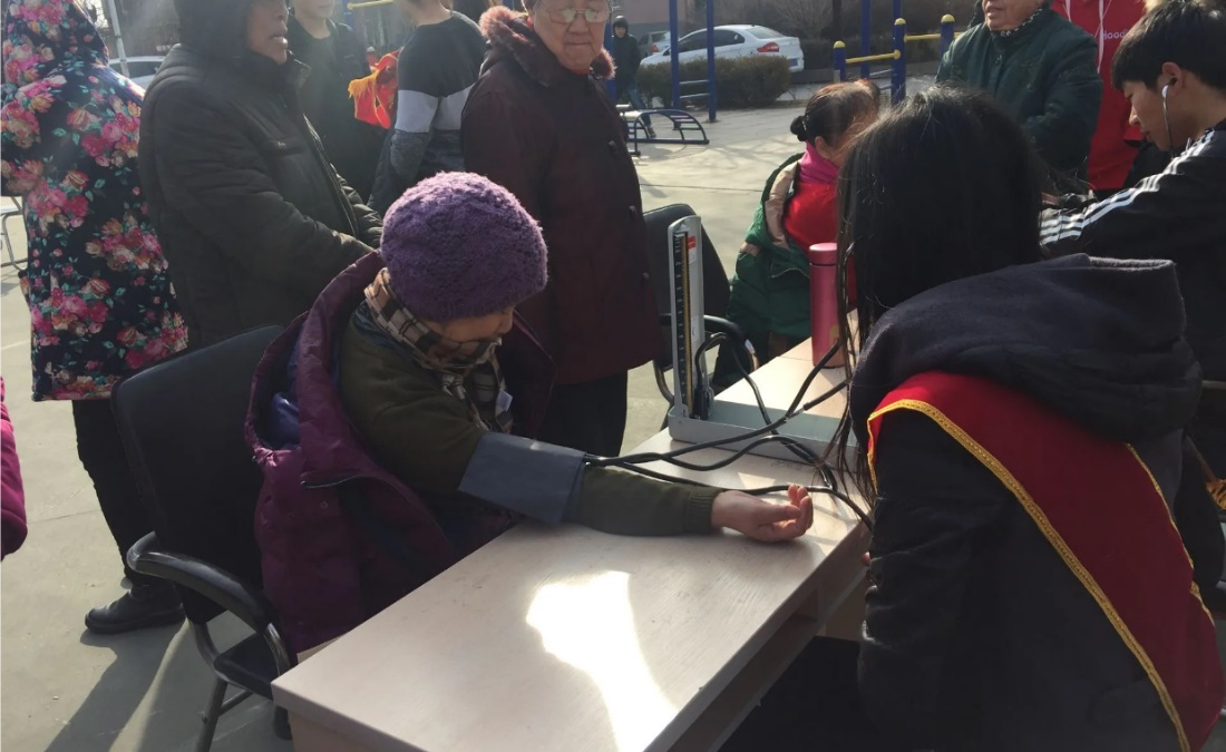 为老人免费测量血压: 为了确保测量结果的准确性,我们提前对团队成员进行了血压测量培训,确保每位成员都能熟练掌握正确的测量方法和注意事项。准备了血压计、记录表、宣传资料等物资,并与社区卫生服务中心的医生进行了沟通,邀请他们为活动提供技术支持和指导。之后在社区活动室设立了血压测量点,团队成员热情地引导社区老年人有序排队进行测量。在测量过程中,志愿者们耐心地与老人交流,询问他们的身体状况和生活习惯,并将测量结果详细记录在记录表上。“您老的身子骨很棒,就是血压要注意控制,少吃油腻的就好,祝您长命百岁!”对于测量结果异常的老人,志愿者们及时提醒他们注意饮食和作息,并建议他们到医院进行进一步检查。同时,志愿者们还向老人发放了健康宣传资料,普及高血压的预防和保健知识,帮助老人树立正确的健康观念。活动结束后,我们将测量结果进行了整理和分析,并将结果反馈给社区生活服务中心,为社区老年人的健康管理提供了参考依据。