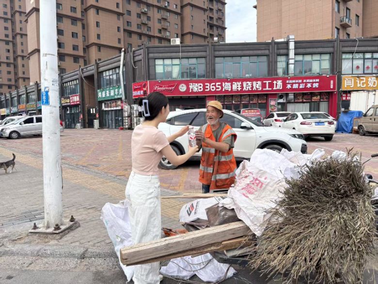 活动现场,志愿者们带着满满的关怀,将一瓶瓶承载着敬意与感恩的瓶装水送到了默默奉献的环卫工人手中。烈日炎炎,这些饮用水成为了环卫工人消暑解渴的 “及时雨”。志愿者们还与环卫工人亲切攀谈,仔细聆听他们讲述日常工作的点点滴滴,深刻体会到了他们工作的艰辛与不易。