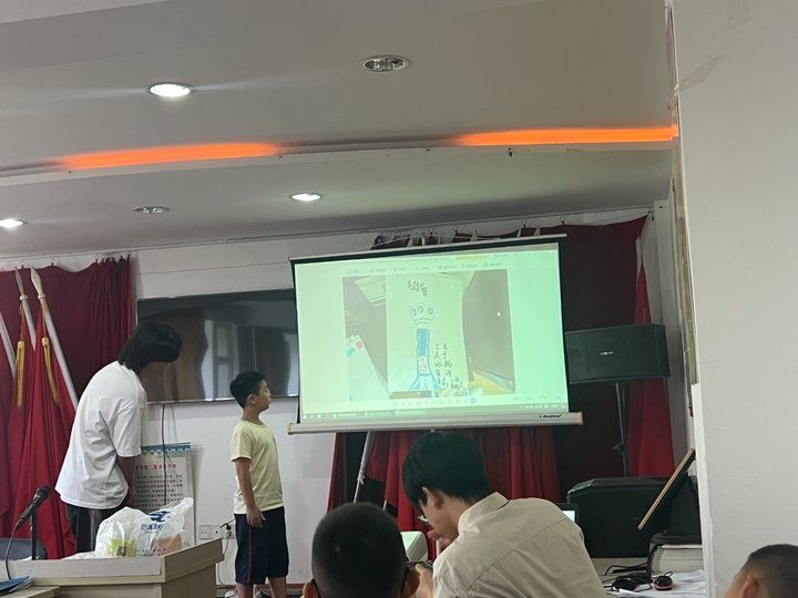 万昊霖的蜡笔画上,扭曲的树根化作交错的蓝色管道,末端延伸出过滤装置。"我的'树根净水器'!"她抱着画走上讲台,"就像树根在土里吸水,这些管道能把脏水变得干干净净!"画纸上特意用黄色荧光笔标注的水流箭头,随着她的讲解轻轻晃动。