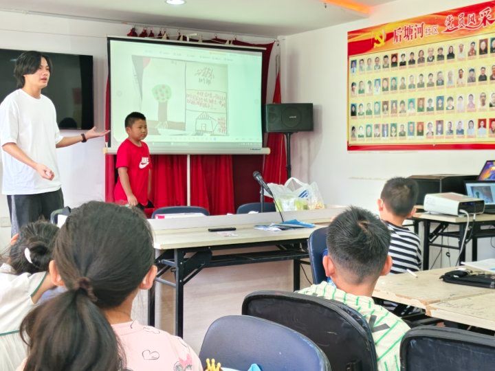 郑颢仪展示的画里,藤蔓编织的小屋顶端扣着蜗牛壳。"这是'蜗牛避风屋'!"他指着画中紧闭的窗户,"刮风下雨时,关上蜗牛壳形状的窗,就能躲在里面听雨声啦!"绿色藤蔓间点缀的紫色小花,让画面格外生动。