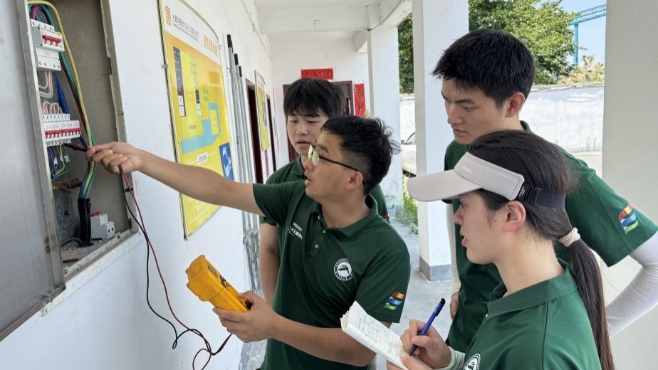 而后,在光伏场办公室,团队成员通过电气检测装置对不同用电装置进行了测量,测量结果表明各个用电装置参数符合规范要求。然后,团队成员在建筑内墙和外墙进行了温度测量,发现指挥部外墙与内墙温差达12℃,隔热性能较差。团队成员提出建议,为降低建筑能耗应该选用隔热材料,进一步增加建筑墙体热阻,同时可考虑在房顶增加隔热层,降低建筑接受的辐射强度。在检测过程中,罗老师结合《城乡建设碳达峰方案》解读:“建筑保温性能是典型的建筑能耗痛点,通过推进‘光伏建筑一体化’既能利用光伏板遮阳降低墙体温度,又能发电节能,是实现建筑领域碳减排的重要路径。”