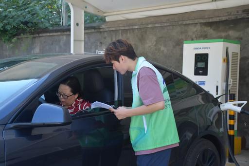 (图为队员孙超能对新能源车主展开调研,雷豪供图)