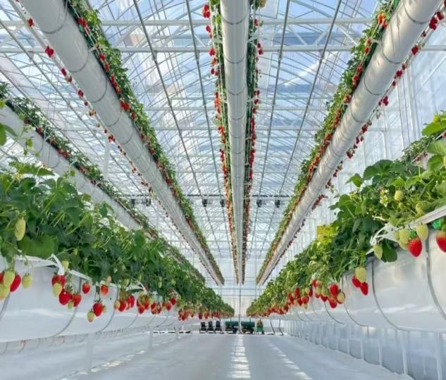 随后,实践团来到了草莓君乐园。这里的悬吊式“天空草莓瀑布”大棚格外引人注目。通过物联网技术,草莓支架高度可灵活升降,游客能轻松采摘到多种不同品种的草莓 。通过走访,服务团了解到除了草莓采摘,乐园还设有露营、萌宠乐园、农耕研学等丰富业态,让游客全方位体验到农文旅融合的乐趣。草莓君乐园采用“村建民用”合作模式,不仅成为了网红打卡地,更成为致富引擎,盘活了村集体资产,带动村民就业。