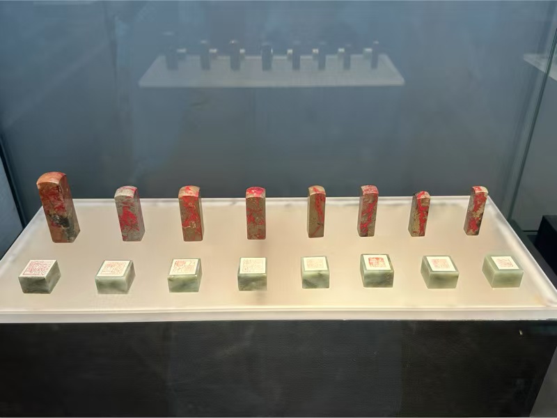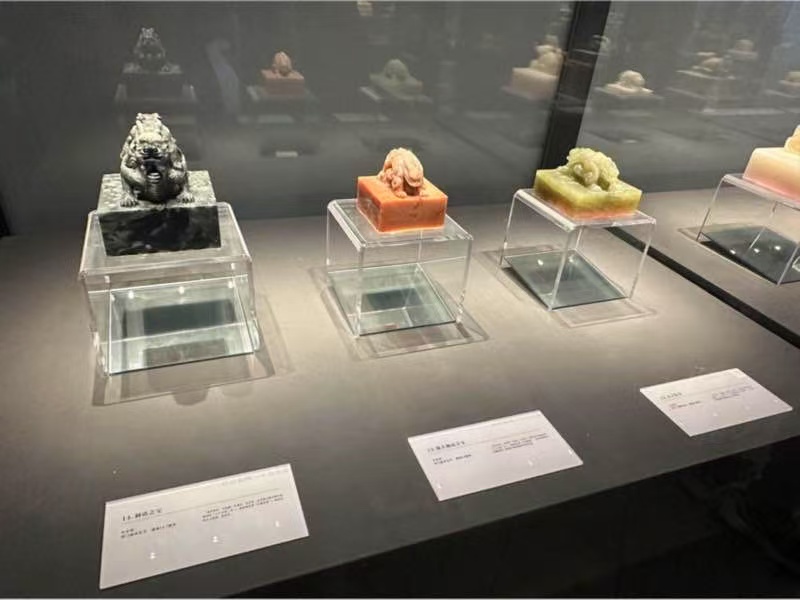 在印章展区,钱友杰详解鸡血石的价值体现:"一枚 2×7 公分的 ' 大红毛 ' 印章(含血量 70% 以上)市值可达 200-300 万,所以我们拿到石料先判断能否切章,不能切章才雕琢成工艺品。" 展柜中,从清代帝王宝玺复刻件到现代文创书签,直观展现了从 "身份象征" 到 "生活美学" 的功能演变。