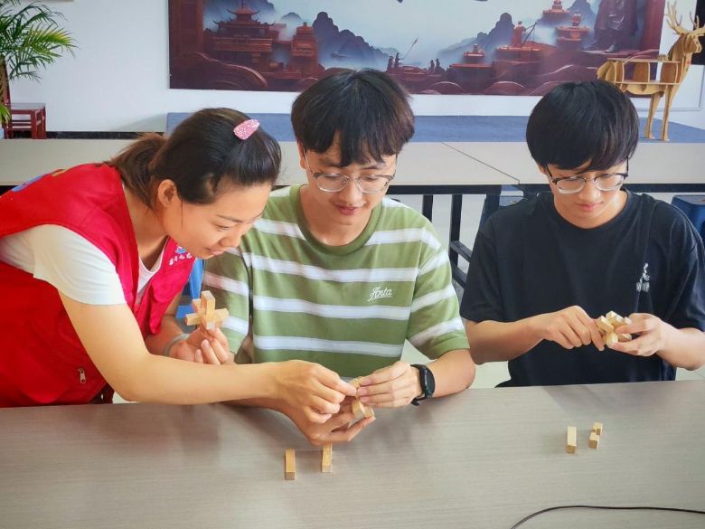 上午,队员们怀着浓厚的兴趣参观了当地珍贵的非物质文化遗产项目。在非遗传承人的悉心指导下,大家亲身体验了香囊制作的巧思与芬芳。一针一线,穿引的是对传统文化的敬意;一草一木,包裹的是驱邪祈福的美好寓意。紧接着,队员们走进了传统木工的世界,聆听木工技艺背后的故事,感受匠人精神的坚守。最令人着迷的是鲁班锁的智慧课堂。面对这些精巧的木质构件,队员们学习了相关知识,积极动手尝试拆解与组装,在“玩”中深刻领悟了古代工匠的非凡创造力和其中蕴含的数学、力学原理,为传统文化的博大精深所折服。