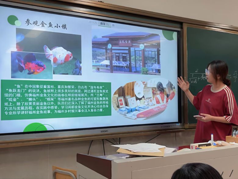 潘氏金鱼:直播电商打开新销路。实践队员展示关中村问卷调查数据:85.7%的村民认可电商直播对经济的促进作用,播放金鱼养殖户通过直播带货的片段,并邀请学生模拟直播台词:“这条‘福寿金鱼’寓意吉祥,点击链接带它回家!”现场笑声掌声不断。