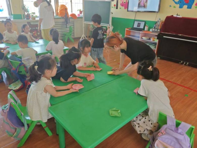 下午,支教的脚步延伸至社区幼儿园。面对活泼可爱的小朋友们,三位同学迅速切换角色,化身为充满活力的 “孩子王”。她们通过讲故事、唱儿歌、做游戏等丰富多彩的形式,带领孩子们在轻松愉快的氛围中学习新知识、培养好习惯。李静教唱的英文儿歌节奏明快,孩子们跟着旋律拍手跟唱;郭敏慧组织的手工小课堂上,孩子们用彩纸折出各种造型,体验着动手的乐趣。