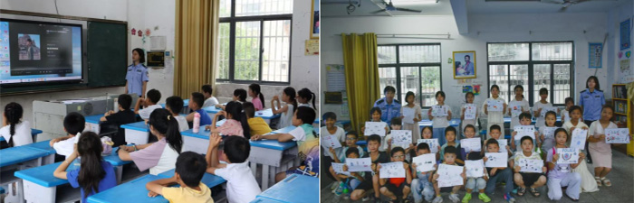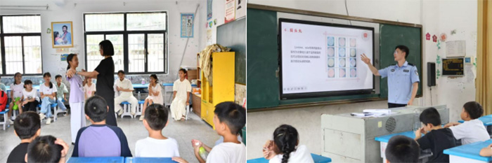 下午,多样化的支教课程正式开课,孩子们按年龄分班参与学习:舞蹈课上,团员们通过分解示范、分组练习,带领孩子们在旋律中舒展肢体,在协作中培养自信;禁毒宣讲课上,团员们结合专业优势,用PPT、短视频和真实案例讲解毒品危害,通过互动问答引导孩子们筑牢自我保护的“法治防线”;歌曲学习课上,红色故事与旋律教学相结合,让孩子们在学唱中感悟家国情怀;绘画课上,以110标志、警徽等法治元素为主题,孩子们用童真笔触描绘对“守护”与“正义”的理解。