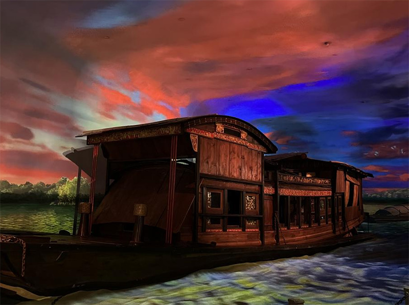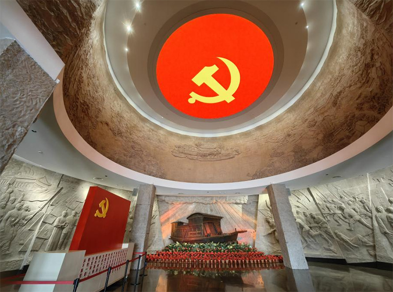 馆内最具象征意义的展品当属红船模型。1921年,中共一大在嘉兴南湖的一艘小小红船上胜利闭幕,庄严宣告中国共产党的诞生。这艘红船,承载着人民重托与民族希望,成为中国革命源头的象征。复原的红船展示区(如下图),让师生得以近距离感受这一开天辟地的历史瞬间,深刻领悟红船精神所蕴含的“开天辟地、敢为人先的首创精神,坚定理想、百折不挠的奋斗精神,立党为公、忠诚为民的奉献精神”。
