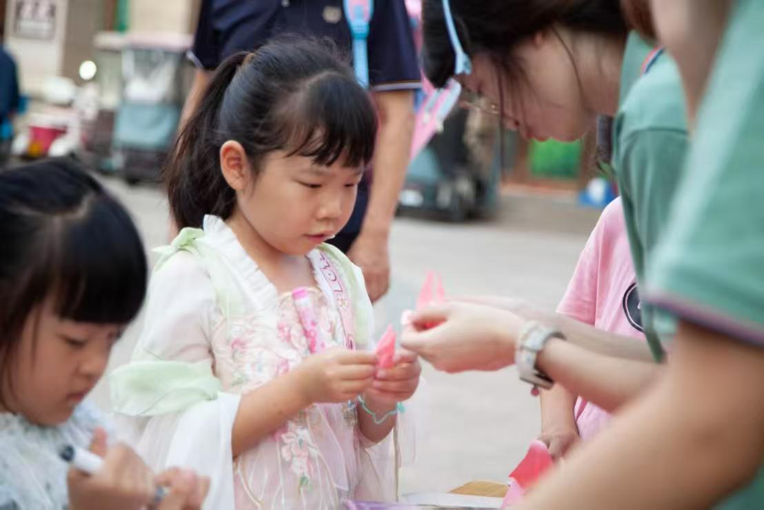 折纸课堂上,志愿者分发彩纸,分步演示青蛙、千纸鹤等经典折纸技艺。孩子们指尖翻飞,在折痕与翻转间,普通卡纸逐渐变成灵动造型:蓄势待跳的青蛙仿佛即将跃出掌心,展翅的千纸鹤似要凌空翱翔。现场惊叹声与欢笑声交织,孩子们争相展示作品,眼中满是创造的喜悦。此次折纸活动不仅锻炼了空间思维,更让孩子们在艺术创造中体会“生命形态”的多样性。
