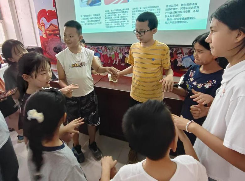 随后,“大手抓小手”趣味抓手指活动登场。实践队员黄兰、闫雪儿带领孩子们围成圆圈,伴随着音乐开展游戏。孩子们在欢快的节奏中尽情互动,在轻松的氛围中释放活力,短暂告别了学习的紧张感。