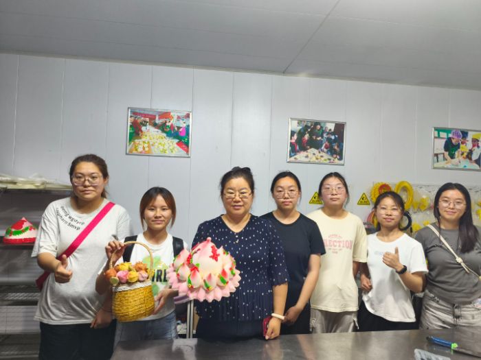 7月9日,实践队采访了胶东花饽饽非遗传承人蔡秉芬老师。在制作场地,队员们了解到花饽饽以中筋面为主料,色彩取自天然果蔬汁,造型主要靠手工捏制,虽然部分字、花等形状会借助模具,但手工才是核心。制作时间因复杂程度不同,从两三小时到一两天不等,醒面环节对酵母、温湿度要求很高,直接影响着花饽饽的造型。与蔡老师交流传承现状时,得知有大学毕业生等年轻人加入传承队伍,但推广和销售仍面临困境。但花饽饽应用场景广泛,无论是生日宴、宝宝宴等传统宴席,还是三八节、高考季等特殊节点,都能以独特造型传递美好祝福。并且销售采取线上线下结合的方式,通过冷链冷冻保鲜,可保质90天且不影响口感。