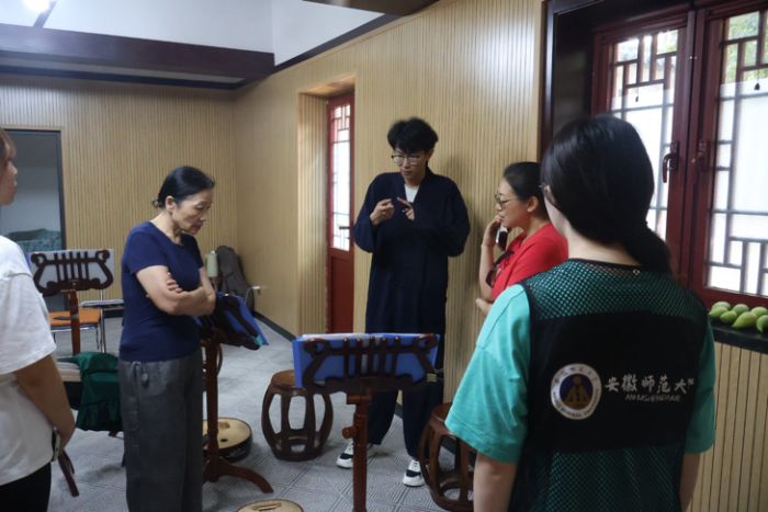 图为安师学子代表与中田纳西州立大学韩梅教授(左二)、青岛大学罗旻教授(右二)、道乐演奏老师(中间)、青岛大学研究生(左一)共同讨论董翔供图