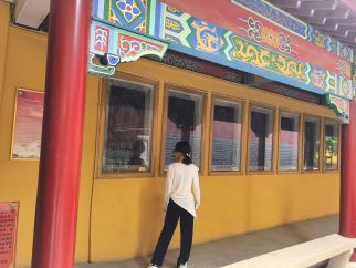 实践队队员们来到龙泉禅寺南门。首先,观赏九龙壁,上面九条游龙破壁欲出,青赤金白诸色交融,鳞片与云纹分毫毕现,在日光里漾起千年古韵。接着,踏入南门,队员们随讲解员穿梭天王殿、大雄宝殿,殿内佛像庄严,经幡轻拂,历史与信仰在此交织;探寻龙泉、御井遗存,听泉水叮咚诉说往昔故事,从建筑规制到人文传说,一步步解锁古寺文化密码,沉浸式感知宗教文化与地域发展的深层联结。