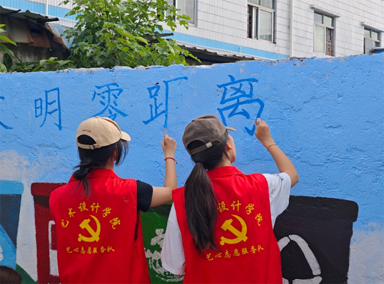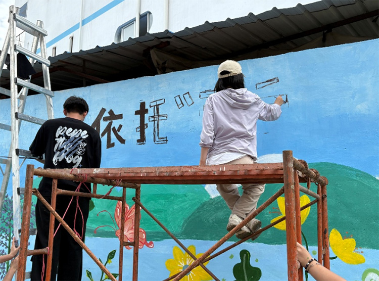 清晨,当第一缕阳光唤醒赤坎村,队员们的身影已活跃于斑驳墙前。调色盘舞动,画笔挥洒,一幅幅生动画卷渐次铺展:志愿者搀扶长者的温情瞬间,绿意盎然的生态家园,践行垃圾分类的文明新风……每一根线条都饱含深情,每一抹色彩都传递着共建美好家园的信念。烈日灼灼,挥汗如雨,但队员们的热情始终如—,他们以艺术唤醒沉睡的街巷,用坚持与汗水诠释青春担当。