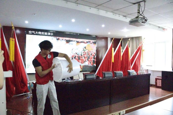理论探索延伸至实践场域。志愿者现场演示了自制“空气大炮”——个直径50厘米的塑料桶体,通过拍击紧绷的弹性膜,发射出清晰的白色烟圈。环状涡环精准穿越两米距离,将排列成阵的纸杯依次击倒。