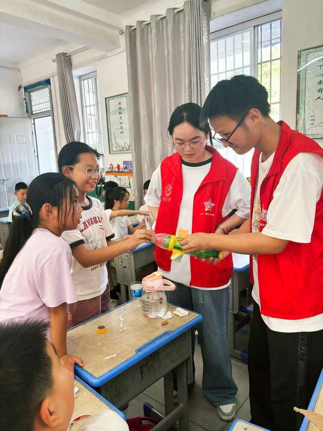 在校园中,实践队为丁家营镇小学学生设计了系列特色课程,包括元勋事迹讲解、红歌传唱、经典诵读、纪录片观影及知识竞赛等,寓教于乐,让孩子们在互动中感悟“两弹一星”精神的深刻内涵。此外,团队创新推出动手实践课程,如卫星模型制作、航天拼图挑战、水火箭实验及主题手工创作,通过“做中学、学中悟”的方式,让科学梦想扎根童心。在社区中,实践队走进乡镇广场、南水北调工程沿线,通过宣讲功勋人物隐姓埋名、无私奉献的感人事迹,推动“大力协同、勇于登攀”的科学精神在基层蔚然成风。