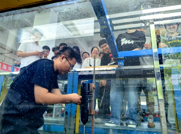 水槽造流实践同样精彩纷呈。在环形波流水槽中,团队成员们体验了造流过程。指导老师介绍,造流系统能够模拟海洋中的不同水流状态,对于研究船舶和海洋结构物在水流中的受力及运动情况具有重要意义。成员们在老师的指导下,尝试设置不同的水流速度和方向,观察水流在水槽中的流动形态。当水流形成稳定的环流时,大家纷纷感叹这一系统的精妙,也意识到海洋中复杂的水流环境给海洋工程设计带来的挑战。