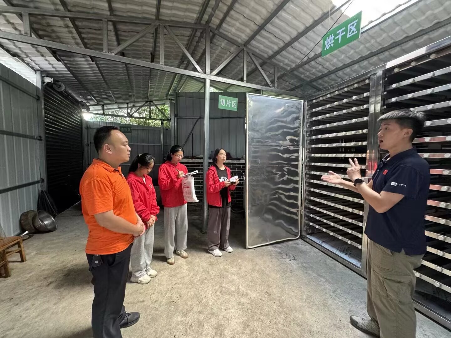 接着,队员们来到广西师范大学投资兴建的竹笋加工厂。这座新建工厂虽未正式投产,但其内部的清洗、切分、烘干、包装、展示、储存六大功能区域规划清晰,分工明确。其中,烘干区的静电场烘干设备已完成安装调试,其工作原理是通过高压静电场使竹笋水分快速蒸发,较传统热风烘干能耗降低约25%,烘干周期缩短至12小时;包装区则联合广西师大设计学院参与设计,旨在突出产品特色。“六大功能区里,清洗区的毛刷清洗机、切片区的分级切菜设备还没到位,这两项配齐得12万元,资金到位后才能试生产。”社岭村第一书记坦言,工厂投产后计划先做竹笋干、竹笋酱,再逐步延伸产业链,以产业发展为引擎,带动村域经济实现整体提升。