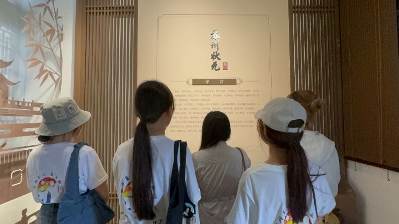 团队随后走访苏州状元博物馆。入口处,祁子涵同学为大家详细讲解状元博物馆的基本情况,吸引游客驻足倾听。进入博物馆,实践团成员们被一幅幅状元画像和一件件珍贵文物所吸引。在清代状元潘世恩的展区,他的殿试答卷字迹工整、论述精辟,展现出深厚的学识功底。