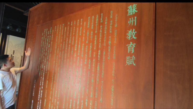 推开柴园古朴的木门,仿佛踏入一条时光的河流。苏州教育博物馆坐落于此。实践团成员在苟鑫鑫带领下,深度挖掘柴园的历史内涵。苟鑫鑫和大家介绍道,北宋景祐二年(1035年),范仲淹放弃风水宝地建私宅,以“立师资,聚群材,陈正道”为理念,慨然捐地创办苏州府学,点燃了苏州官学教育的星火。明清两朝,苏州以51名状元、1882名进士冠绝天下,成就“状元之乡”美誉。
