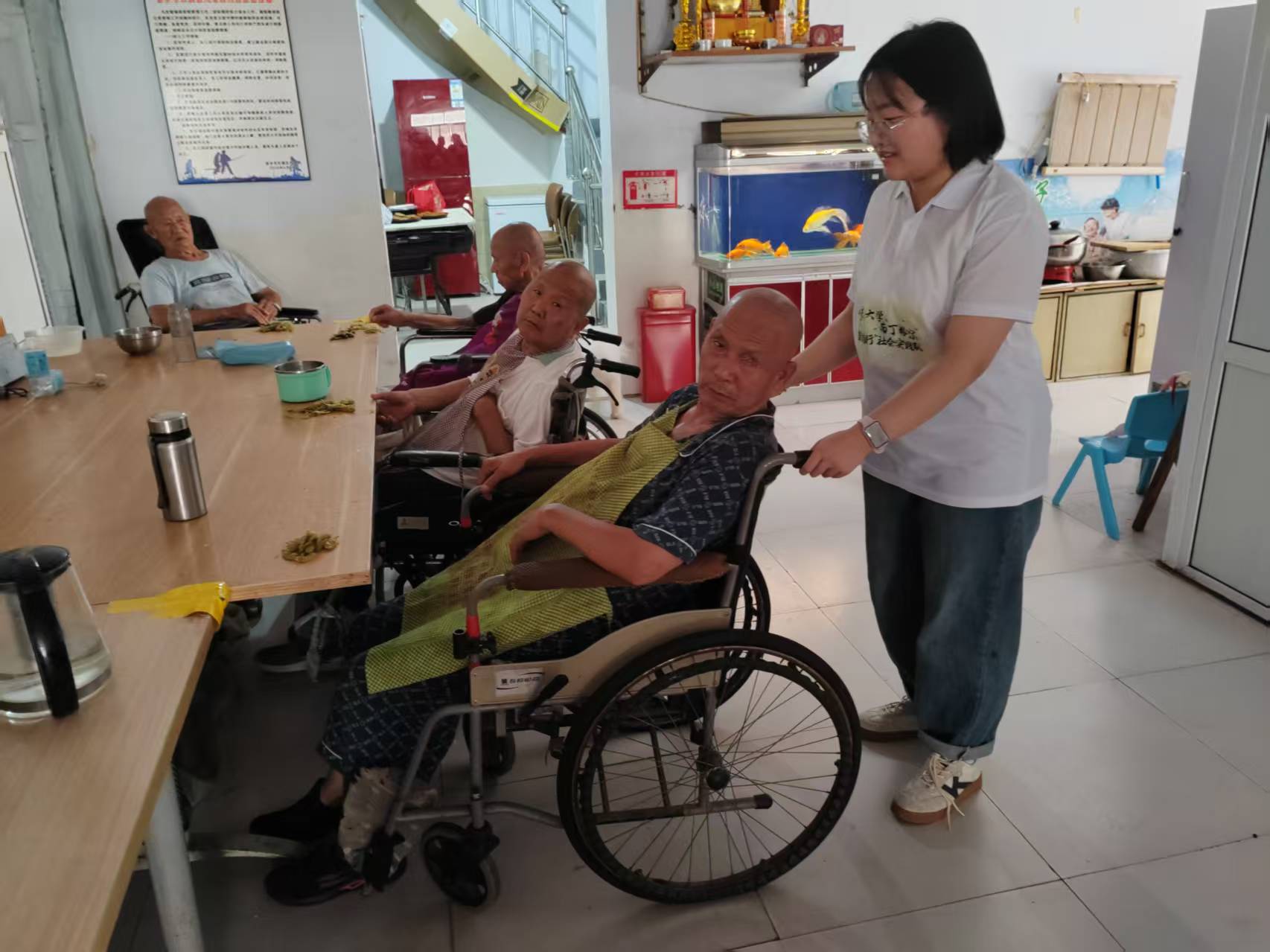 与老人们交流结束后恰逢养老院自由活动时间,团队成员看到那些坐着轮椅行动不便的老人在餐桌旁不能移动,便主动上前询问了老人的需求,推动轮椅带老人回了房间,还细心地为老人检查了轮椅安全带。在随后的打扫卫生环节,团队队员仔细清扫了地面,为老人们营造了一个更加干净整洁的环境,还特地细致清扫了老人们的日常互动区域,防止老人们在活动时跌倒,用自己的实际行动践行了孝道。