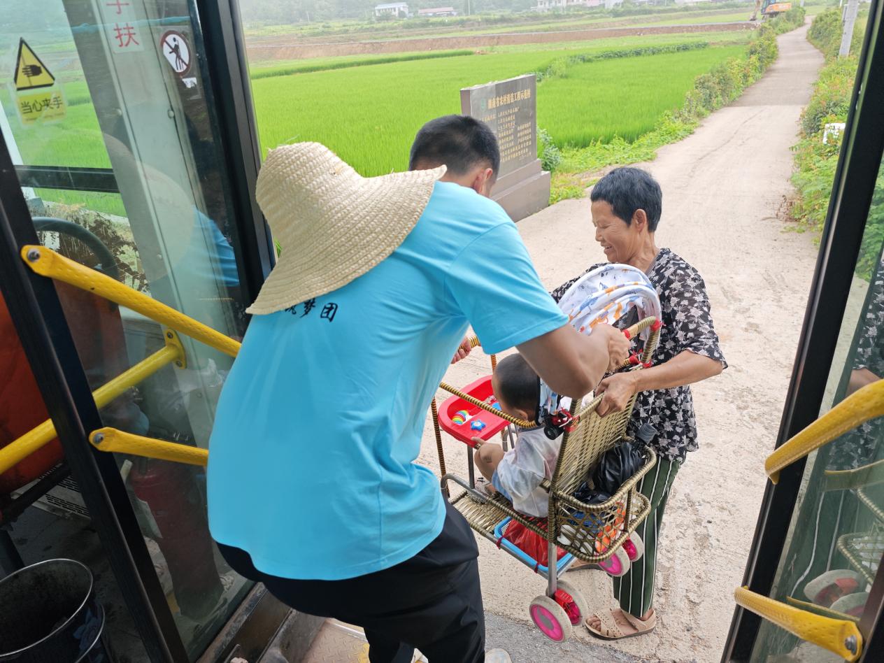 此外,在公交车上,一位奶奶带着年幼的孙辈正准备下车,却因婴儿推车太重而面露难色。团队成员见状立即上前,一边稳稳抬起推车,一边细心搀扶祖孙二人安全下车。细微之处见真情,这些暖心举动赢得了村民们的连连称赞。