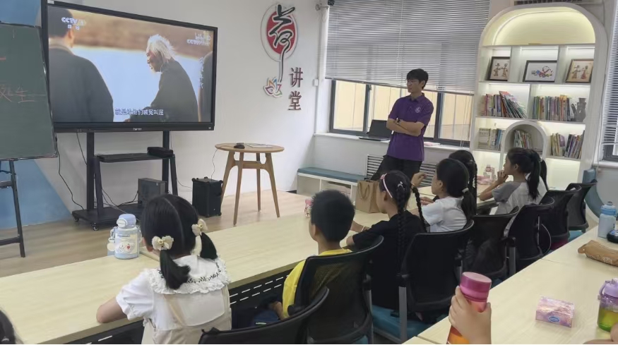 为了让这段历史更加直观和震撼,讲解环节结束后,实践团组织学生们观看了精心挑选的《中国共产党诞生》纪录片片段。银幕上,一幕幕珍贵的历史影像、一幅幅生动的历史画面,将听到的知识变成了鲜活的场景,让同学们更加深刻地理解了中国共产党从南湖红船上扬帆起航的伟大开端,以及早期共产党人为民族复兴抛头颅、洒热血的坚定信念。观看过程中,孩子们神情专注,眼神中充满了对先辈的敬仰和对历史的思考。