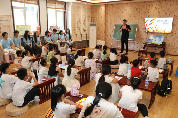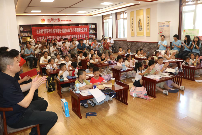 2025年7月15日,“薪火相传,麦田助教”实践队来到淄博市张店区积家村党群服务中心的国学堂,在此举行2025年度“薪火相传,麦田助教”齐小团暑期公益课堂开班仪式。张店团区委青少年服务中心主任邹梁杰、房镇镇团委书记李政梁、积家村党支部委员袁涛,以及实践队成员、各位家长和孩子均到场参与。